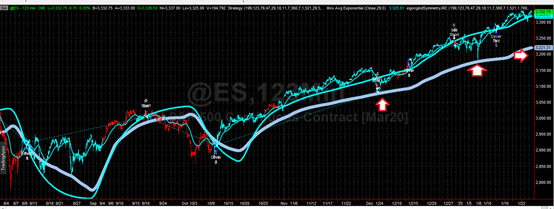 Trading often involves considering multiple time-frames, and one relatively higher time frame chart (2 hour) used for C2 systems GALEFORCE and HYPERSTATE below chart image (proprietary indicators) The idea is that if ES breaks below 3300 next stop 3200 or thereabouts may not necessarily be a straight line drop the key concept is it would travel below the gray bottom line (The previous two attempts the gray line acted as support but the pattern is to break below it becomes higher probability when it has previously acted as support) (To be noted neither system would be directly trading this setup were it to obtain but the scenario serves as an input to a more complex underlying algorithm)